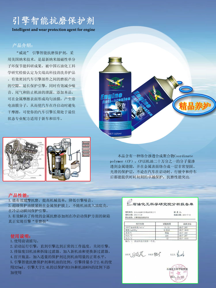 “威凌” 引擎智能抗磨保護劑,是美國納米技術,新納米級磁性單分子環保節能科研成果,被中國石油化工科學研究檢驗認定為尖端高科技清洗養護品。有效密封汽車引擎部件之間的磨損產出的空隙。延長保護引擎,同時有效減少噪音、尾氣和防止機油的泄露。添加本品,可在金屬摩擦表面形成均勻油膜,產生帶電油膜分子,從而使汽車在冷啟動避免干摩擦,可使你的汽車引擎長期處于好的狀態。專業配方適用于新車和舊車。