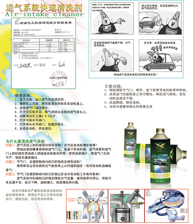 “威凌” 進氣系統快速清洗劑,是美國納米技術,新納米級磁性單分子環保節能科研成果,被中國石油化工科學研究檢驗認定為尖端高科技清洗養護品,本產品能徹底清洗發動機進氣管路,包括節氣門、節氣閥和燃燒室等部位的積碳等沉淀物,改善進氣性能,恢復正常空燃比,使發動機怠速更平穩,可改進燃燒,降低油耗迅速恢復發動機性能,明顯改善尾氣的排放,對氧傳感器和催化轉換器無害。