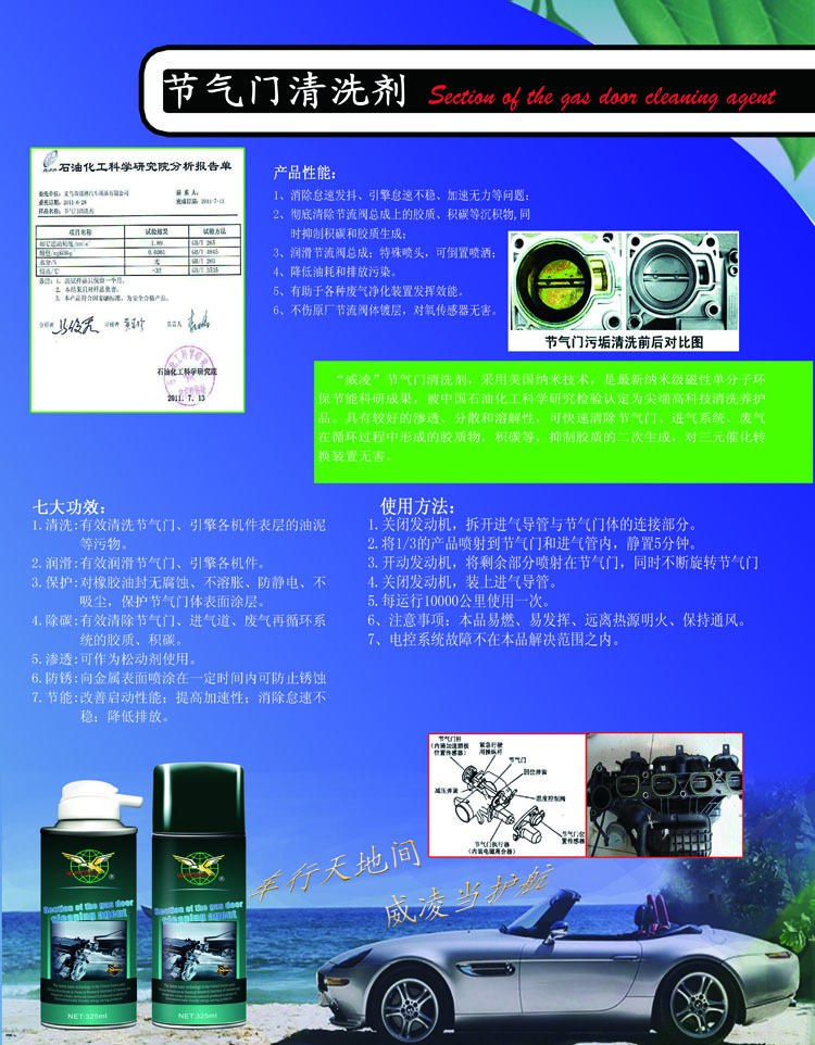 “威凌”節(jié)氣門清洗劑,是美國納米技術(shù),新納米級磁性單分子環(huán)保節(jié)能科研成果,被中國石油化工科學(xué)研究檢驗(yàn)認(rèn)定為尖端高科技清洗養(yǎng)護(hù)品。具有較好的滲透、分散和溶解性,可快速清除節(jié)氣門、進(jìn)氣系統(tǒng)、廢氣在循環(huán)過程中形成的膠質(zhì)物,積碳等,抑制膠質(zhì)的二次生成,對三元催化轉(zhuǎn)換裝置無害。