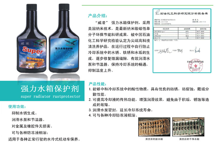 “威凌” 強力水箱保護劑,是美國納米技術,最新納米級磁性單分子環保節能科研成果,被中國石油化工科學研究檢驗認定為尖端高科技清洗養護品,在運行過程中自行防止冷卻系統中的水銹、鐵銹和水垢的生成,逐步修復微漏縫隙,有效潤滑水泵和節溫器,保持冷卻系統的暢通,抑制溫度上升。